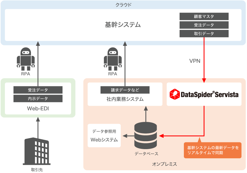 - DataSpiderにより、システム間のデータを自動で連携する仕組みを構築