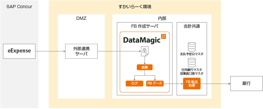 そのなかのひとつが、経費精算システムのリプレースだ。2023年10月にスタートするインボイス制度への対応なども見据え、クラウドサービス「SAP Concur」へ移行。また、データ変換ツール「DataMagic」と組み合わせることで、承認された経費データを、口座振り込みに必要な「ファームバンキングデータ(以下、FBデータ)」へ変換する処理を自動化。担当者の手間をなくすとともに、メンテナンス性の高い仕組みを実現した。