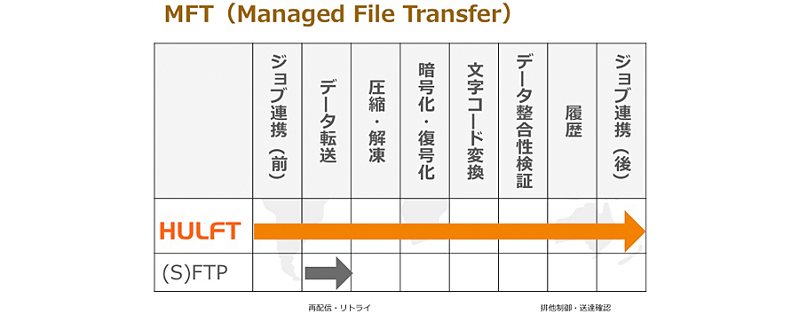 こういった各種処理を業務システムで実装するためのソフトウェア群がHULFTなのです。HULFTは、ファイルを転送するだけであるFile Transferソフトウェアではなく、管理されたファイル転送であるManaged File Transferソフトウェアなのです。