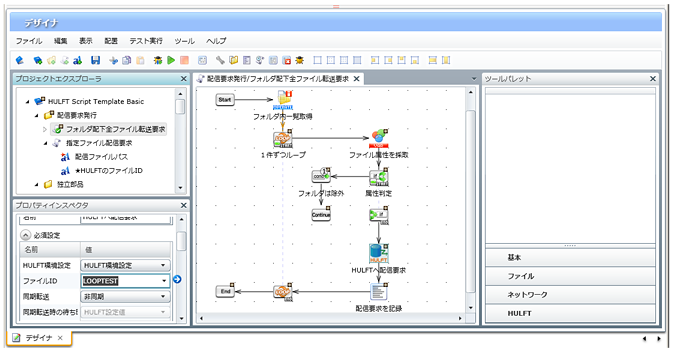 以下の画面例は、HULFT Scriptテンプレートに含まれる「配信要求/フォルダ配下全ファイル転送要求」を使ったときの例です。