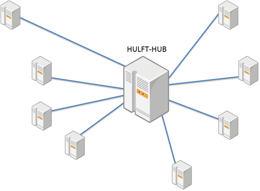 HULFT運用のテクニックとして、そういった設定の複雑さを回避するため、ある特定の拠点が中継地点となり、複数の拠点間の接続を処理したうえで接続を行うという「HUB」のような枠割を持たせるというものがあります。