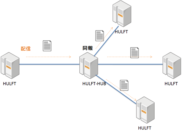 さらに、HULFTからの配信を「中継」したり、複数のHULFTに対して「同報」することも可能です。