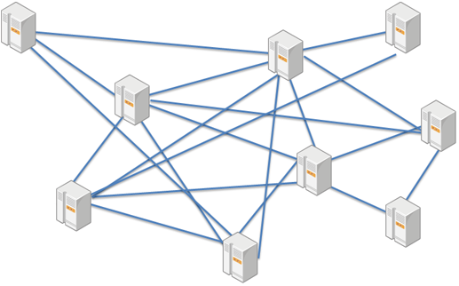 3拠点程度であればフルメッシュでも問題はないのですが、拠点数が増えると、それぞれの拠点から他の拠点への接続も増えます。複数の拠点同士でファイル転送が必要な業務が存在し、その業務内容をそのままHULFT転送で実現する設定を行う場合、拠点同士を接続する必要が発生してしまうのです。情報工学に「組み合わせ爆発(Combinatorial explosion)」という言葉があるように、この問題は非常に一般的なものです。
