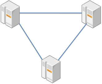 たとえば、3箇所の拠点に1つずつHULFTが動作していて、それぞれの拠点間での通信が必要である場合、それぞれの拠点は他の2拠点との接続を行うフルメッシュな接続になります。