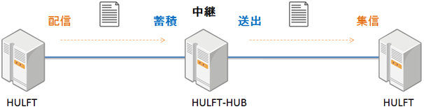 HULFT-HUBでは、「配信」と「集信」という表現とは別に、「蓄積」と「送出」という表現が使われます。HULFT-HUBは、HULFTからの配信を必要に応じて蓄積したうえで、設定通りに蓄積されたファイルを送出できるためです。