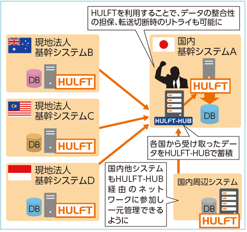日本国内にある複数拠点も、HULFT-HUBに同時に接続しています。