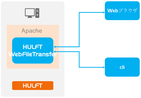 Apache TomcatによるWebサーバを稼働することで、Webブラウザなどとの通信を実現してたうえで、HULFTへのファイル転送を仲介します。
