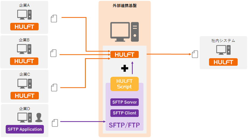 HULFT8 Ver.8.4.0のHULFT ScriptでSFTP機能を有効にしたうえで、既存のHULFTネットワークとの外部連携基盤を構築すると、以下の図のようになります。