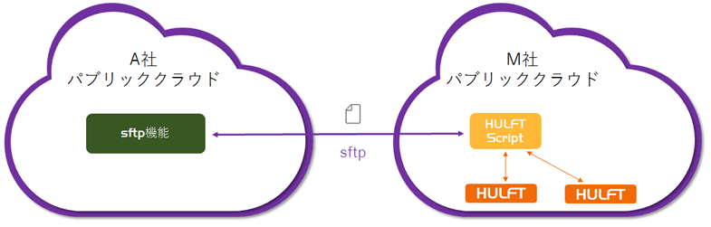 この図では、パブリッククラウドとHULFTが稼働している外部連携基盤が、sftpによってファイルの送受信を行う環境を表しています。