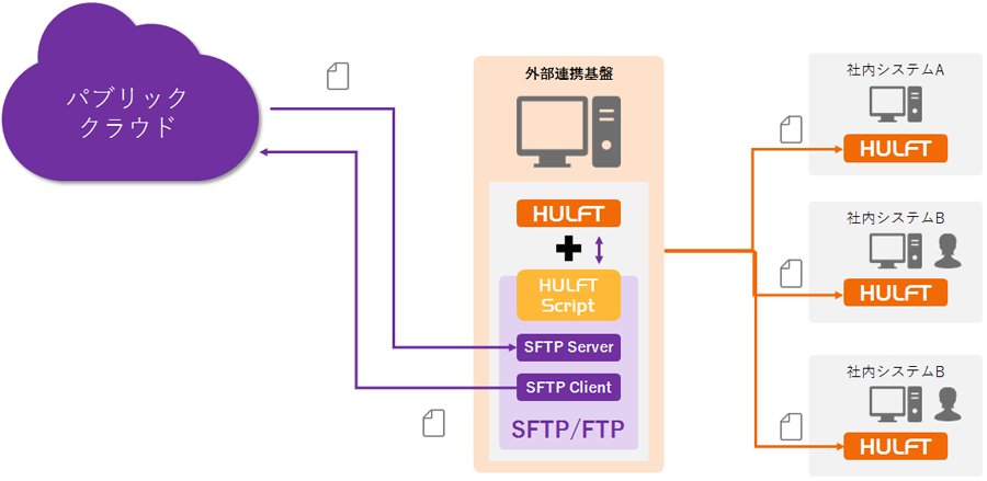 たとえば、異なる2種類のパブリッククラウドが存在し、片方でHULFTエコシステムが存在しているときに、もう片方のクラウドが提供するsftp機能を使ってHULFTエコシステムに対してファイル転送を行えます。