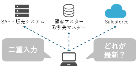 - 基幹システムとSalesforceが連携していないため、同じ情報を二重入力しなければならない