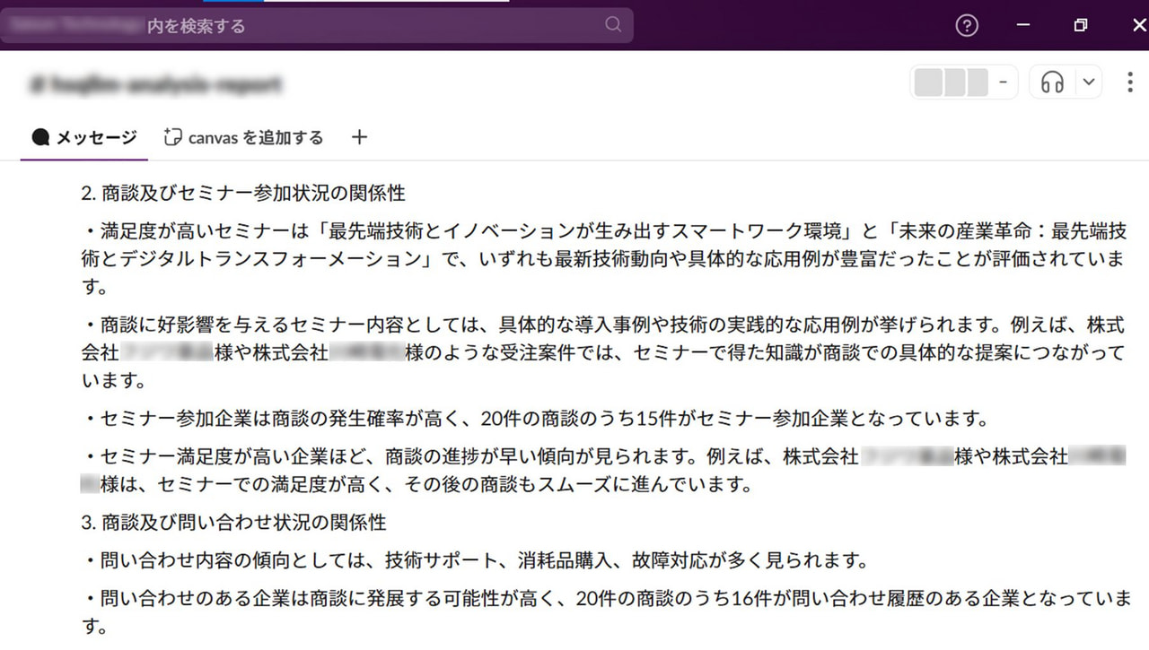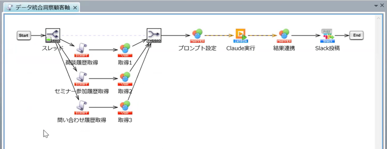 例えば上記の処理では、営業部門が持つ商談データ、マーケティング部門が持つセミナー参加データ、カスタマーサポート部門が持つ問い合わせデータを統合して、生成AI(Claude Sonnetモデル)にデータを連携し、その結果をコミュニケーションツール(Slack)に投稿しています。