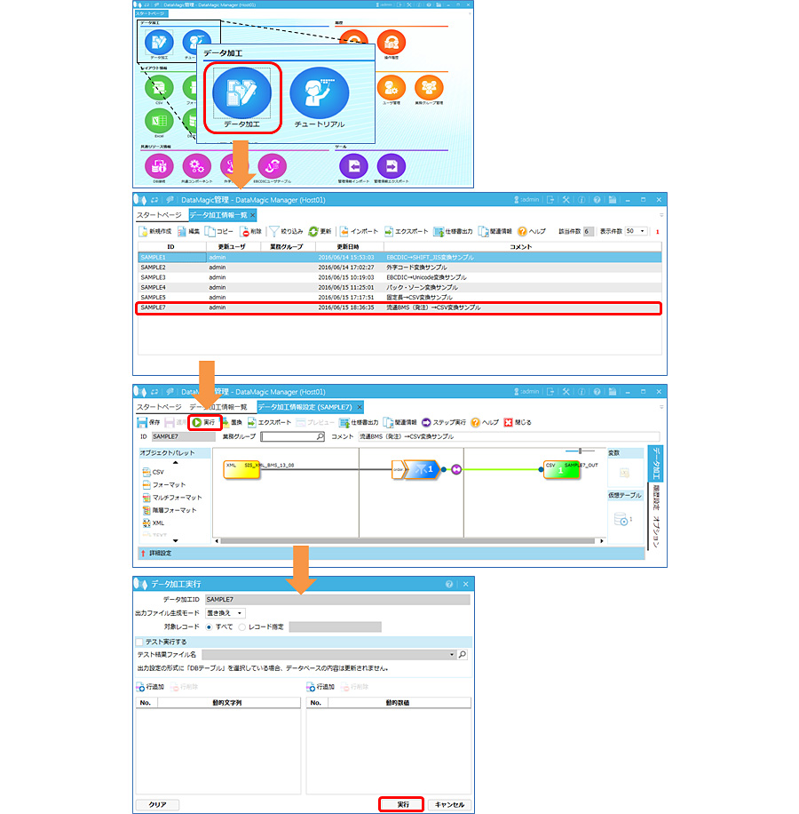 手順2において登録したSAMPLE7というデータ加工情報IDをダブルクリックし、入力設定および出力設定のファイル名が正しく設定されていることを確認します。画面から、SAMPLE7のデータ加工情報IDを開き、画面上部にある「実行」ボタンから行います。