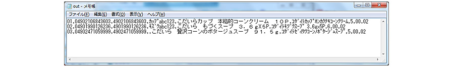 手順3において実行が完了すると、出力設定において指定されたC:\work\SAMPLE7\に“out”というファイルが出来ているのでメモ帳等のエディタで確認して下さい。