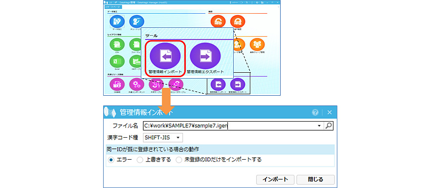DataMagic の管理画面を起動し、ダウンロードしたスクリプトファイルをDataMagicに取り込みます。取り込みはスタート画面の[ツール]にある[管理情報インポート]アイコンをクリックします。管理情報インポート画面においてダウンロードしたファイルを指定し、インポートボタンをクリックします。取り込みが成功すると、データ加工情報一覧画面にSAMPLE7というIDが登録されます。