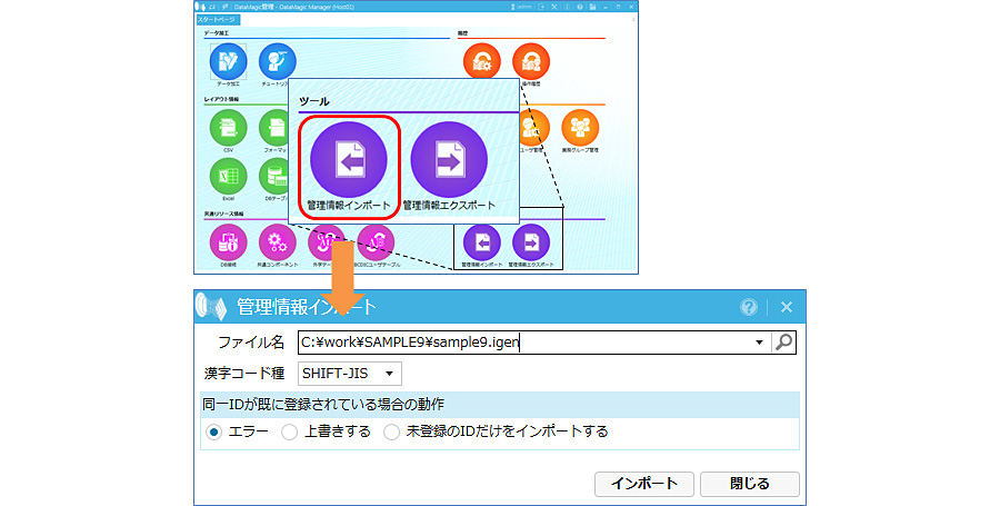 DataMagic の管理画面を起動し、ダウンロードしたスクリプトファイルをDataMagicに取り込みます。取り込みはスタート画面の[ツール]にある[管理情報インポート]アイコンをクリックします。管理情報インポート画面においてダウンロードしたファイルを指定し、インポートボタンをクリックします。取り込みが成功すると、データ加工情報一覧画面にSAMPLE9というIDが登録されます。