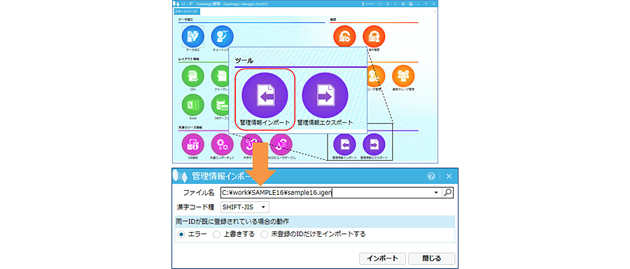 DataMagic の管理画面を起動し、ダウンロードしたスクリプトファイルをDataMagicに取り込みます。取り込みはスタート画面の[ツール]にある[管理情報インポート]アイコンをクリックします。管理情報インポート画面においてダウンロードしたファイルを指定し、インポートボタンをクリックします。すると、データ加工情報一覧画面にSAMPLE16というIDが登録されます。