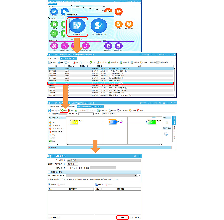 手順2において登録したSAMPLE16というデータ加工情報IDをダブルクリックし、入力設定および出力設定のファイル名が正しく設定されていることを確認します。画面から、SAMPLE16のデータ加工情報IDを開き、画面上部にある「実行」ボタンから行います。