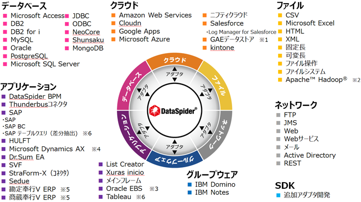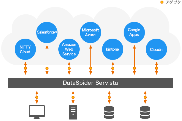 データ連携ツールであるDataSpider Servistaを使えば、オンプレミス環境と各種クラウドサービスを手間なく柔軟に連携できるようになります。各種クラウドサービス用アダプタはもちろん、SAPやLotus Notes、固定長、Excel、各種RDB、メールなど多種多様な連携用アダプタを装備。これらのアダプタを活用してGUIで設定するだけでクラウドとオンプレミスをつなぐハイブリッドなデータ連携を手軽に実現でき、柔軟なシステム運用が可能になります。