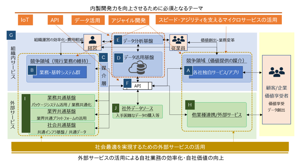 また、データ活用基盤(D)・データ分析基盤(E)なども想像しやすいですね。