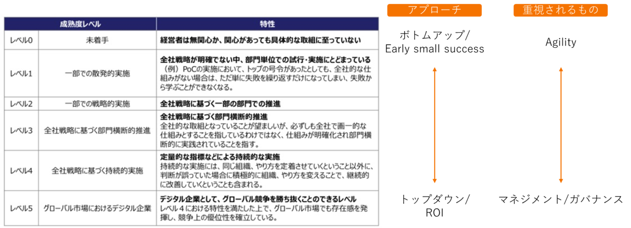 一方で成熟度が上がってくるとトップダウンで統制を持った取り組みというのが重要になります。