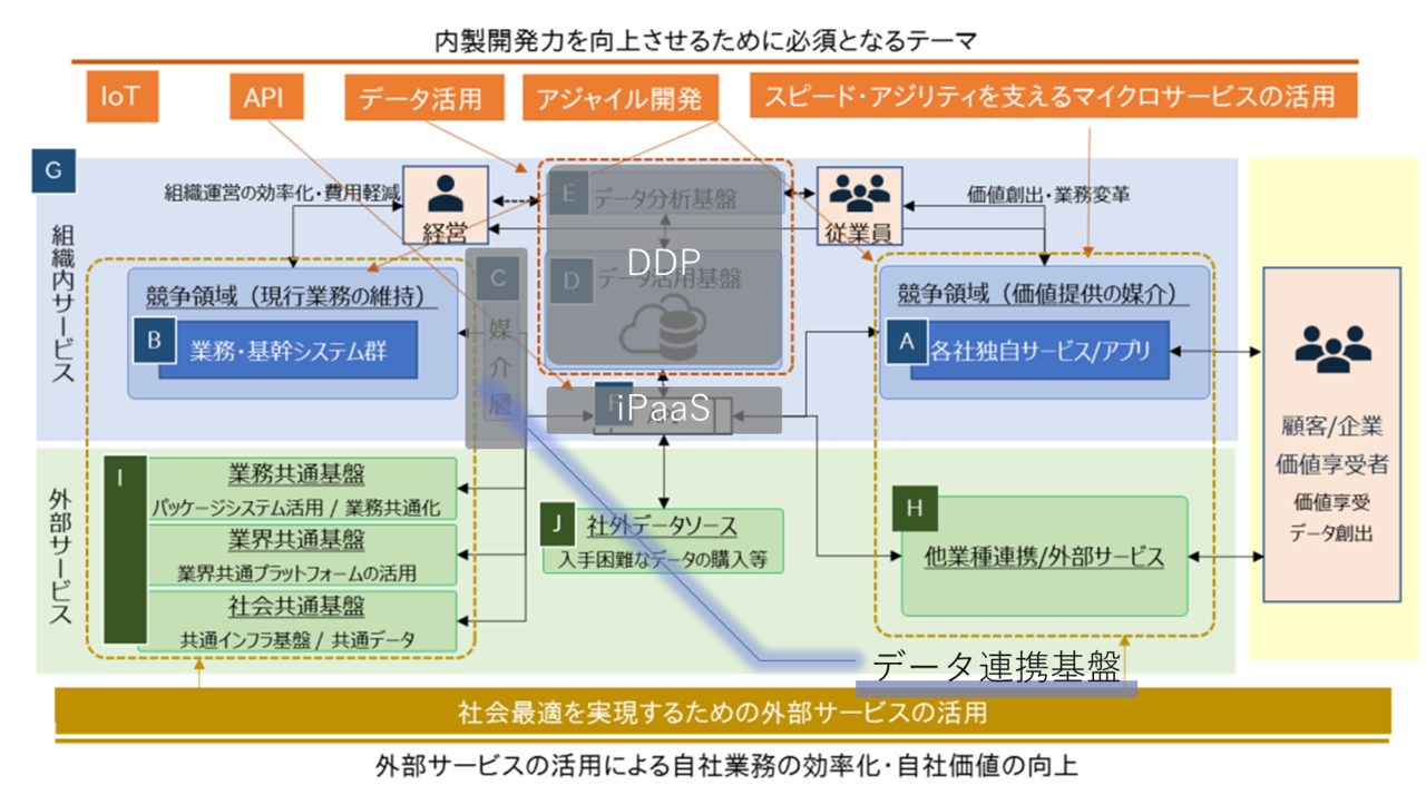これを私たちの言葉で表現すると、媒介層(C)がデータ連携基盤であり、API(F)がiPaaSにあたります。