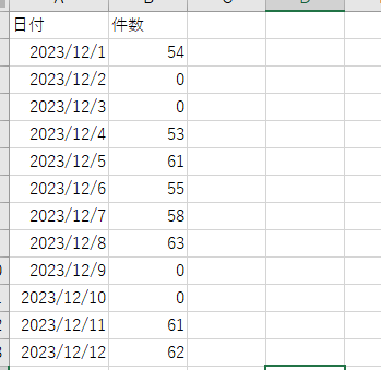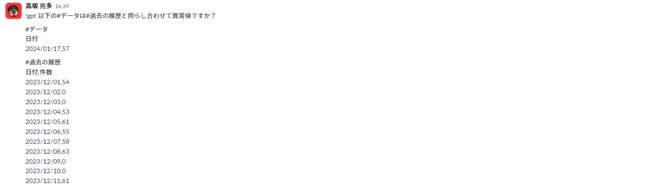 これをベースのデータとして、ある日の発生データに異常がないかを生成AIに聞いてみようと思います。