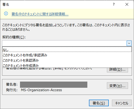 ここまで理解してきたことを思い出してみましょう。Wordに印鑑とか署名の画像ファイルを貼り付けるみたいものではなく、署名や捺印により「誰が作った文書か」「誰が合意/承認したのか」などを表明するところが本質でした。ですから、このドキュメントを「私が作成しました」「私が承認しました」「私が作成及び承認しました」ことを表明する(見えない)電子データを付加できる機能となっています。