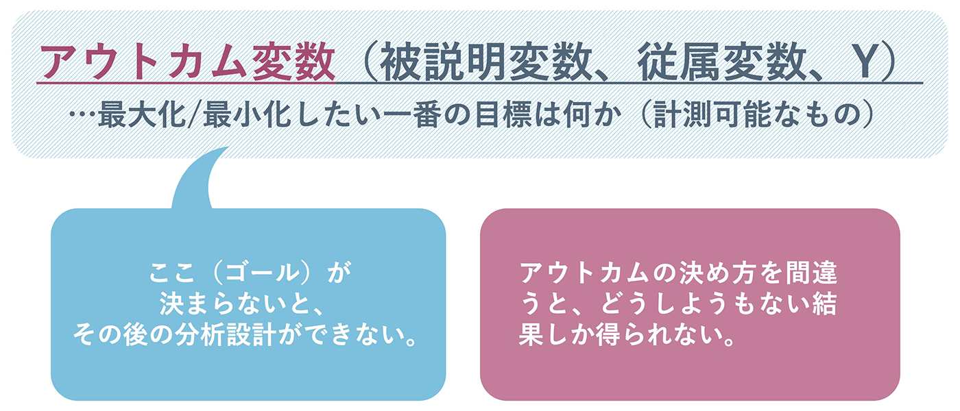 ビジネス課題の設定は、ふわっとした課題感を、詳細に言語化していくプロセスです。言語化の最終ゴールは数字に落とし込むこと。数字に落とし込んだ課題のことを、データ分析では「アウトカム変数」といいます。