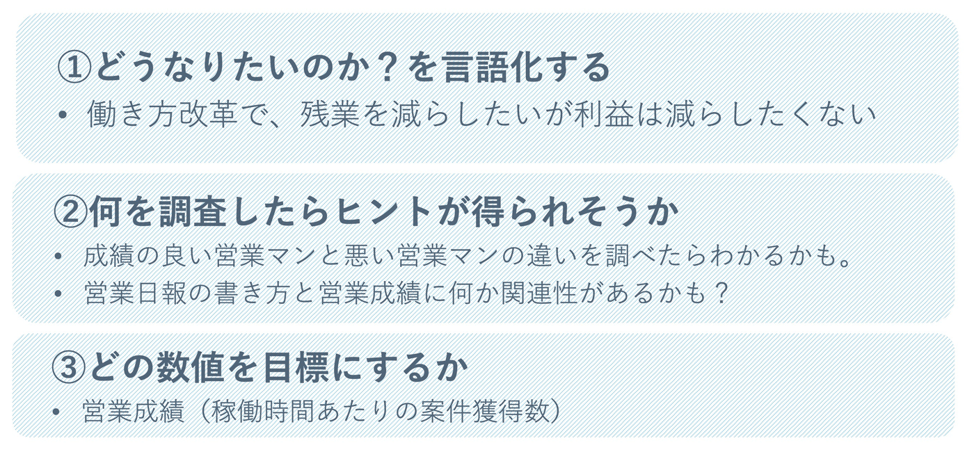 といった課題を設定することができます。ここまで課題が明確になっていれば、あとはスムーズにいきます。しかし、ここまで読んでくださった方の中には、「理解はできたけど、その3つをどう設定すればいいのかイメージできない」と思った方もいるかもしれません。とくに「①どうなりたいのか?を言語化する」は、ビジネス課題の設定の第一歩を意味していますが、この段階で「そもそも課題を見つけられないことが課題なんだ」ということをよくお聞きします。私の経験上でも「課題の設定や解きたい問題といわれてもよく分からない」という方は非常に多いです。でも安心してください。あのパブロ・ピカソが「描こうとするものを知るには描きはじめねばならない」と言ったように、あまり完璧主義にならず、まずは着手しやすく効果が上がりそうなことからスタートして成功体験を積んでいくことが大切です。そうすることでその後の社内の協力も得やすくなるため、スモールスタートで始めてみましょう。