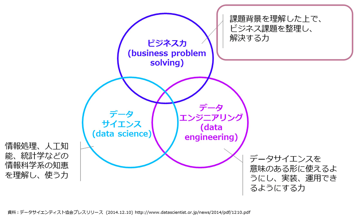 左の「データサイエンス」という部分は、統計学などのロジックの知識を持っていることを表しています。そして右の「データエンジニアリング」は、データベースを操作したり、ITツールとして実装したりできるスキルを表しています。一方で上の「ビジネス力」は、業界や業種の知識を持ち、ビジネス課題を整理して解決していく力を表しています。