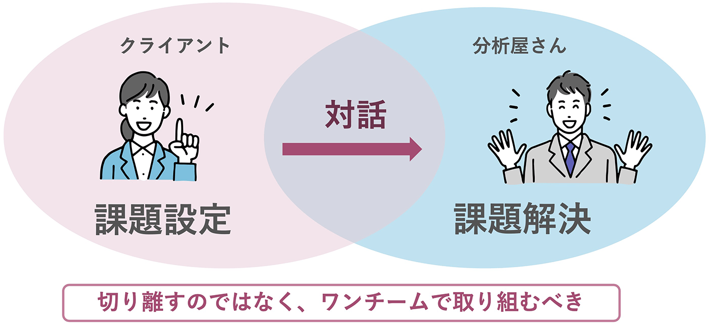 データサイエンティストやエンジニアは、設定した課題を解く力には長けていますが、解くべき課題を設定するのは、あくまでクライアント自身ということを忘れないでください。(一緒に設定していくこともありますが、筋の良い仮説はクライアントが握っていることが多いです。)