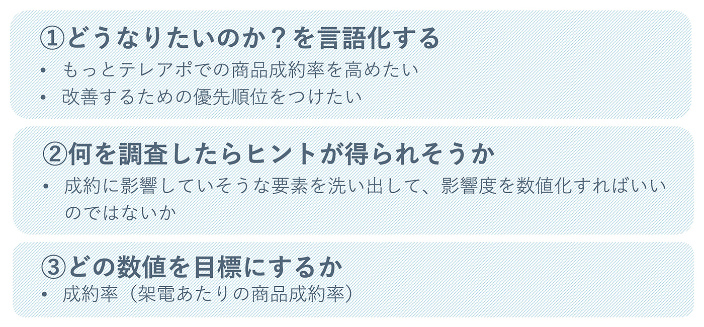 ビジネス課題設定の仕方について、例を挙げながら簡単に説明していきます。例えばBtoCのテレフォンアポインター会社なら、「商品の成約率を高めたいが、架電をする時間帯や架電担当者、顧客属性、スクリプトのどの要素が一番成約率に影響しているかが分からない。改善の優先順位をつけたい」といった悩みがあるとします。これをデータ分析のためのビジネス課題として設定するためには、次の3つの流れで考える必要があります。
