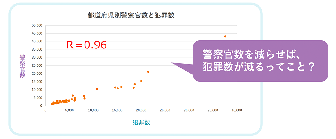 ということ。あくまで相関関係は2つの値の連動性の指標であり、一方の値を変化させるともう一方の値も変化する因果関係とは異なります。例えば、警察官の多い都道府県は犯罪件数が多いというデータを見ると、警察官数を減らせば犯罪件数が減るってこと?と考えてしまう方もいるかもしれません。しかし言い方を変えて、警察官の数を減らすという原因によって、犯罪件数が減るという結果が起きるのかといえば、そうではありません。こういった例を、