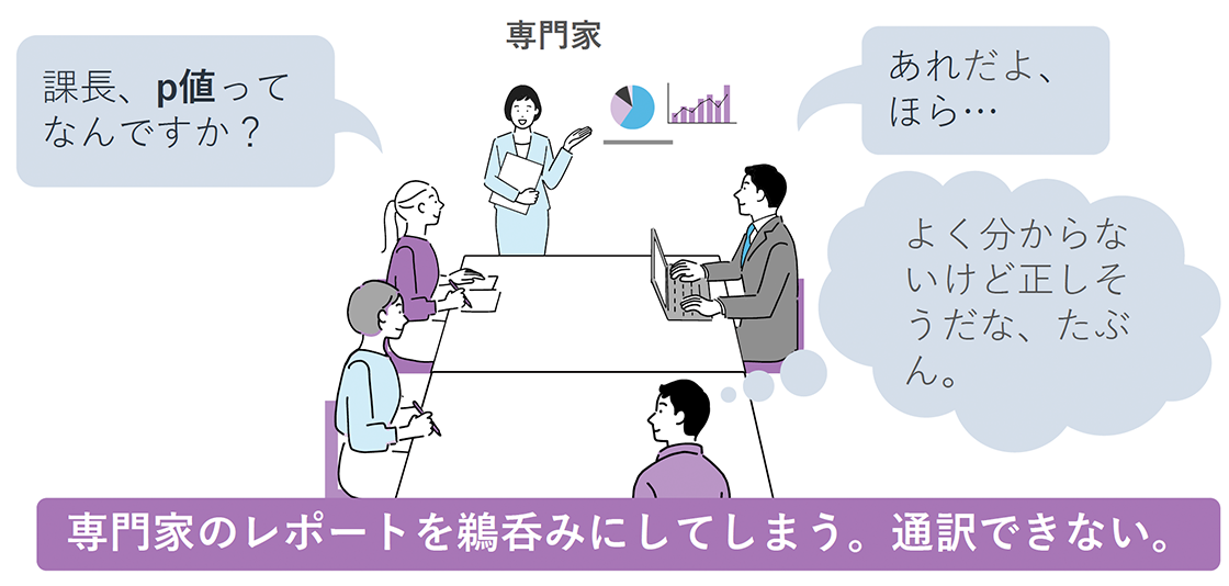 統計学が役立つ具体的なビジネスシーンについて例を上げてみましょう。社内で「この施策を打てば売上が上がると思います」というようなプレゼンをする場面はよくあると思います。その際「いいアイディアだけど、根拠あるの?」と聞かれて「やってみないと分かりません」としか答えられない……そんな経験のある方も多いのではないでしょうか。統計学の知識がないと、企画・提案の定量的な根拠を用意できず、相手を説得できない結果に終わってしまうことがあります。また、専門家にレポートを解説してもらう場面で、それぞれの数値の意味が分からず質問できなかったり、専門家の意見を鵜呑みにして社内に持ち帰るも、その内容を通訳できない状況に陥ってしまう例もあります。