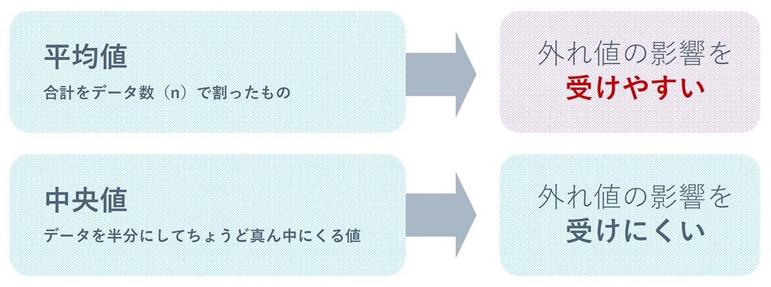 - 平均値:データを足してnで割ったもの(外れ値の影響を受ける)