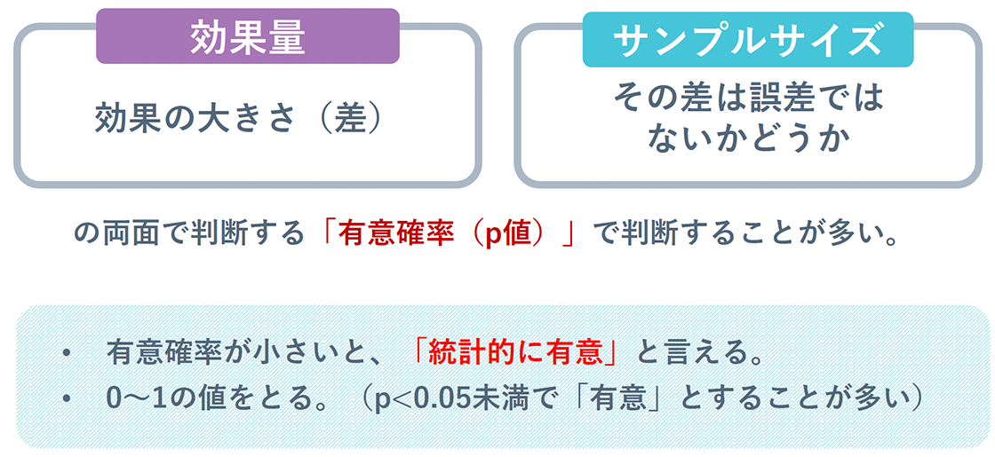 判断する側でいえば、例えば広告出稿者がWEB広告を実施するときに、デザインAかデザインBで迷っていたとします。このとき、反応率はAの方がよかった、つまりAとBで差があったので効果があると考えるかもしれません。しかし、果たしてその差は誤差ではないのか、またサンプルサイズは適切な量かという点を明らかにしなければなりません。