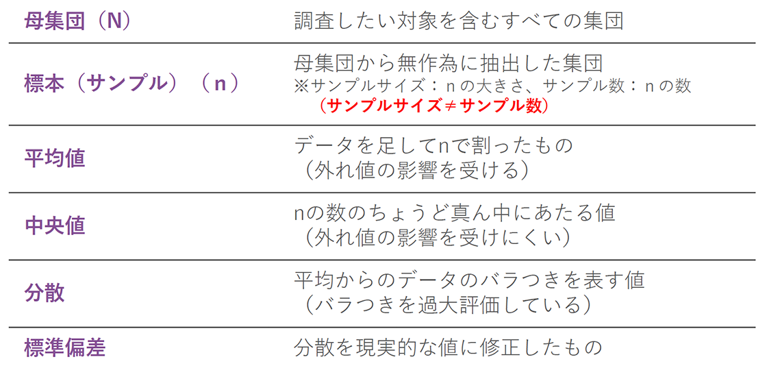 弊社ではデータを活用しています、と公言するためには、最低限の統計学用語を理解すること、そして誤用を防ぐことが大切です。ここでは、よく使用する用語について解説していきます。