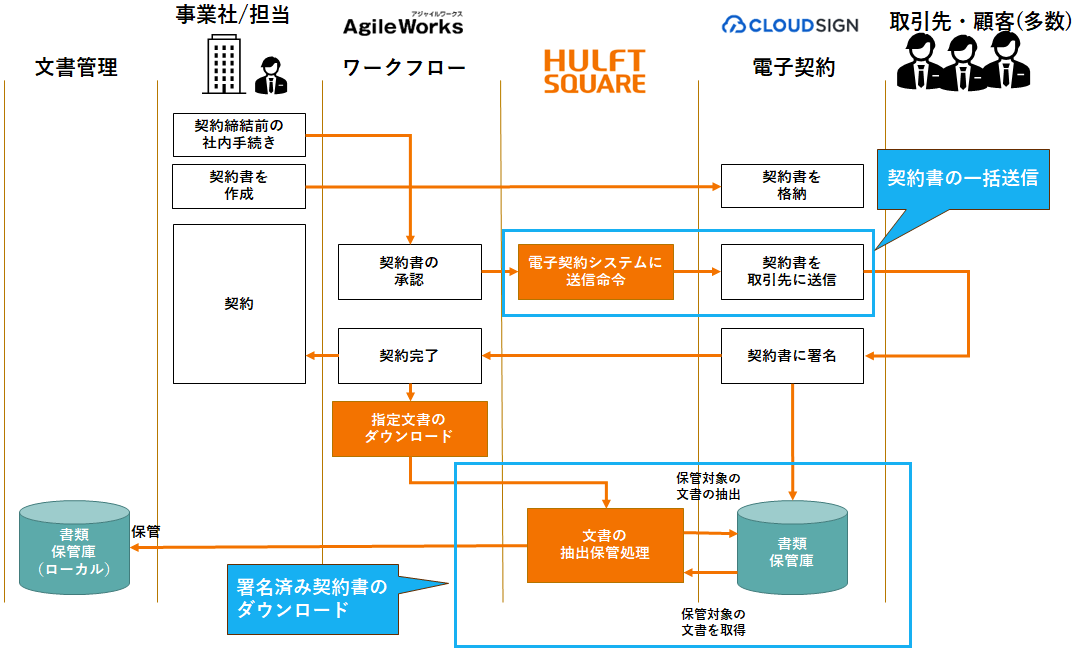 電子契約システムは、契約書画像データへの署名欄追加・取引先へ送信・署名状況の管理、契約書画像データ保存を担います。HULFT Squareとの連携で、承認後の取引先への自動送信(一括送信)と文書管理システムへのアーカイブが可能になります。