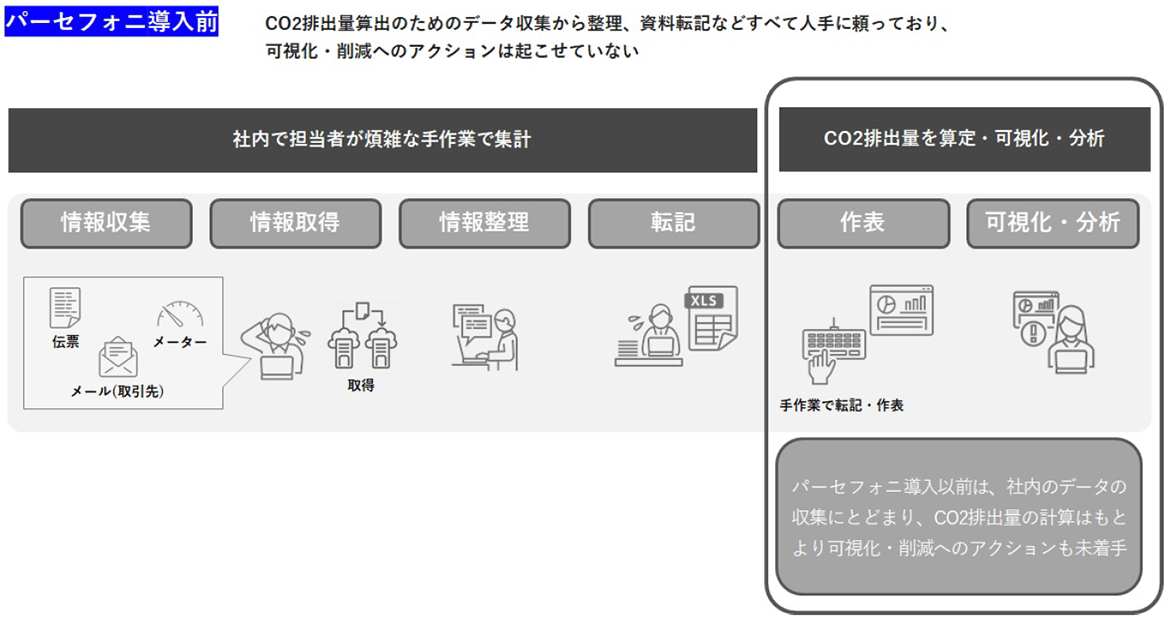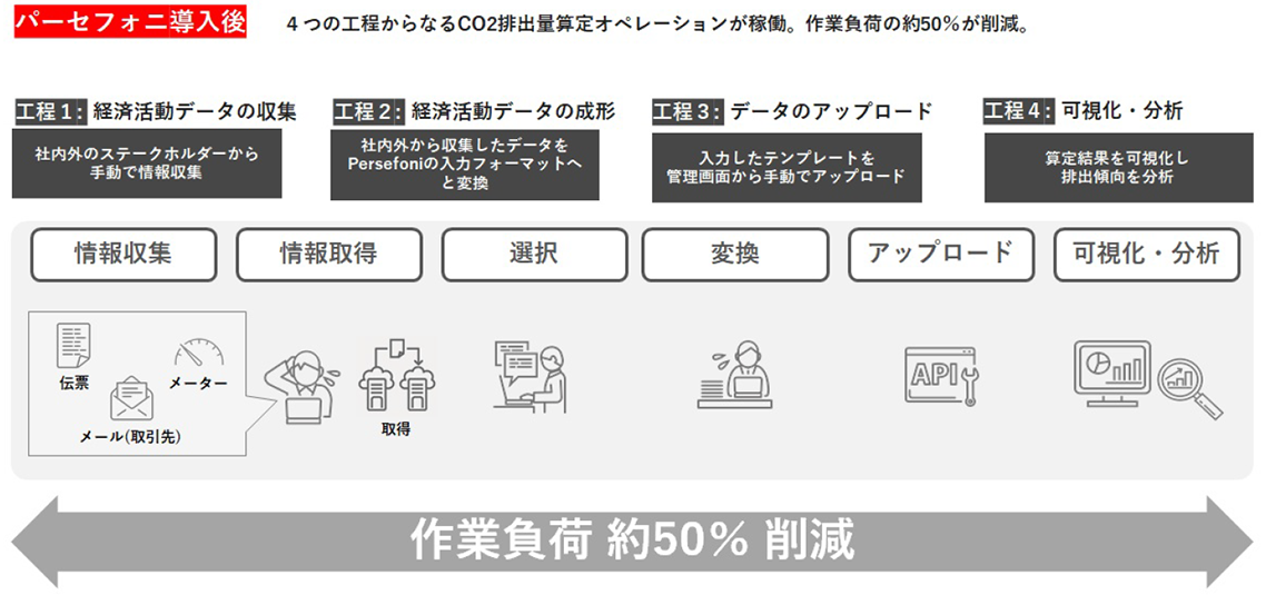 社内でCO2排出量を算定する作業は大きく4工程(経済活動データの収集・経済活動データの成形・作表・可視化/分析)に分類されます。パーセフォニを導入することにより、50%程度の作業負荷削減が期待できます。