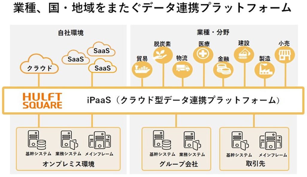 HULFT Squareは、DX実現に必要な「データ活用するためのデータ準備」や「業務システムをつなぐデータ連携」を支援する日本発iPaaS(クラウド型データ連携プラットフォーム)です。オンプレミス・クラウド・SaaSなどの環境に分散し管理されているさまざまなデータを、業務システム間、業種、国・地域をまたぎデータを連携させることができます。