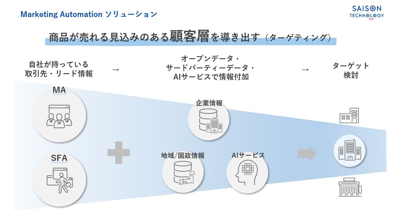 今回提供開始のHULFT SquareアプリケーションによるMAソリューションでは、取引先やリード情報に企業情報や統計情報の付与やAIでデータを考察することで、商品が売れる見込みのある顧客層を導き出します。