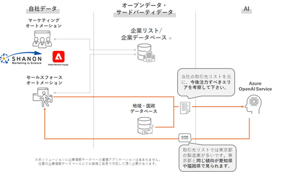 具体的な手順としては、まず、Adobe Marketo EngageやSHANON MARKETING PLATFORM等のMAツールにお客さまが保持する取引先やリードの企業情報に、企業リストや企業データベースから取得した企業情報を追加します。さらに、取引先の企業情報とe-Stat政府統計データを結合し、プロンプトとともにAzure OpenAI Serviceへ送り結果を得ます。たとえば、下記のようなプロンプトを送って活用するなど、自由な形でAzure OpenAI Serviceに指示を出すことができます。