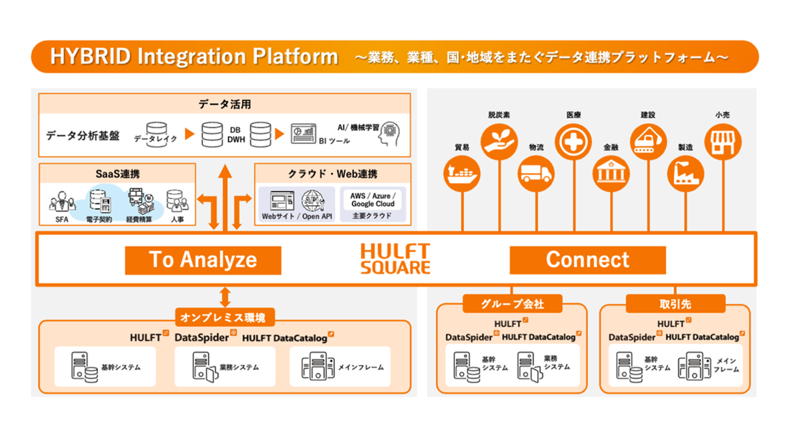 HULFT Squareは、DX実現に必要な「データ活用するためのデータ準備」や「業務システムをつなぐデータ連携」を支援する日本発iPaaS(クラウド型データ連携プラットフォーム)です。オンプレミス・クラウド・SaaSなどの環境に分散し管理されているさまざまなデータを、業務システム間、業種、国・地域をまたぎデータを連携させることができます。