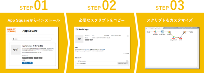 このテンプレートを利用することで、自社のニーズや環境に合わせてのカスタマイズや作成したスクリプトの部分活用など、業務改善の効果をすぐに得られます。動かしながら学ぶサンプル教材として、スクリプト開発の学習にも利用いただけます。このテンプレートは、HULFT Squareを契約中のすべての方が追加料金なしで利用可能です。