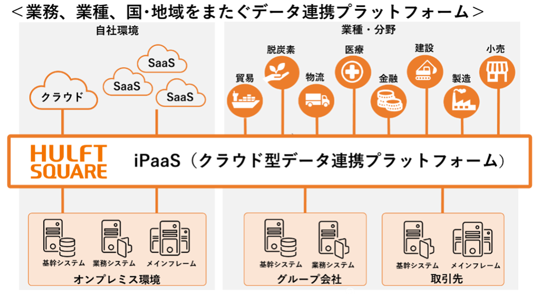 「HULFT Square」は、DX 実現に必要な「データ活用するためのデータ準備」や「業務システムをつなぐデータ連携」を支援する日本発iPaaS(クラウド型データ連携プラットフォーム)です。オンプレミス・クラウド・SaaS などの環境に分散し管理されているさまざまなデータを、業務システム間、業種、国・地域をまたぎデータを連携させることができます。