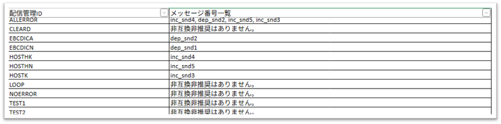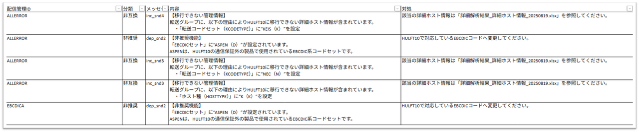 「一覧」では、ID単位に非互換・非推奨機能の有無や、メッセージ番号を出力し、「詳細」では、メッセージの内容や対処を出力します。