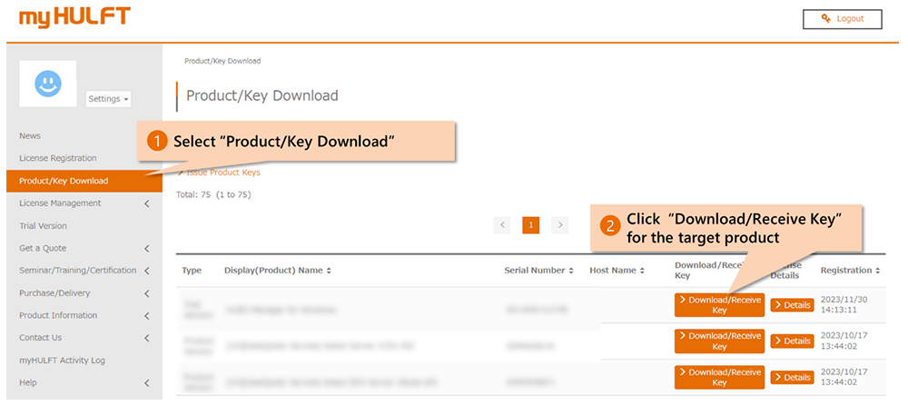 myHULFT is a dedicated customer page for downloading software for products and trial versions, as well as for issuing various keys required for using products and trial versions. It also provides functions to check purchased license information and support-related information.