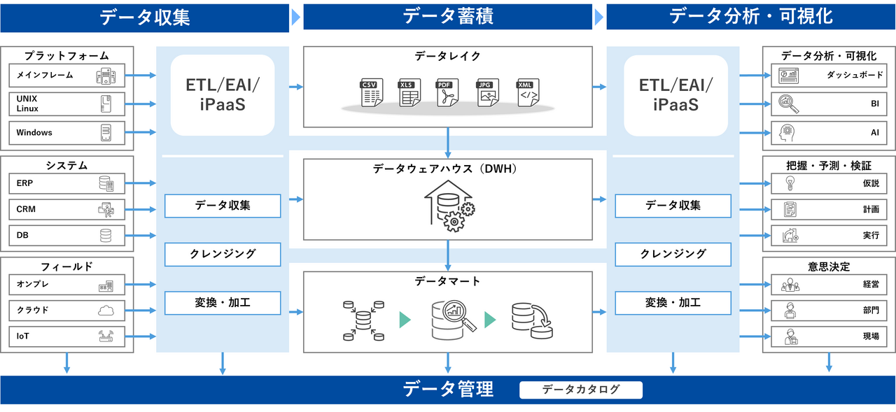 あらゆるビジネスでデータの重要性が増す中、複数のシステムや部門に分散したデータを統合的に管理する仕組みを持つことは、もはや不可欠です。これを一体的に支え、ビジネスに活かせる形で活用するのがデータ基盤です。