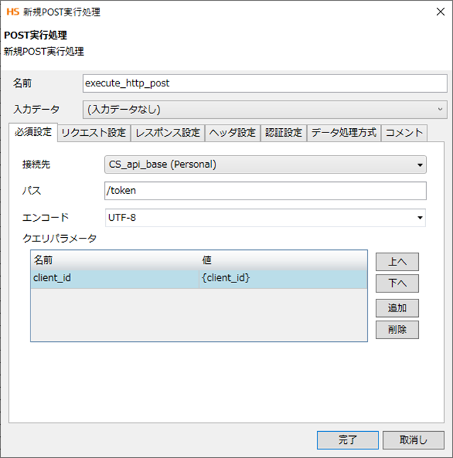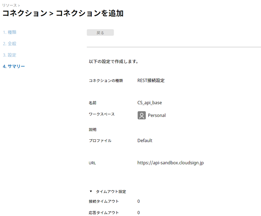 今回利用するAPIの最終的なendpointは[https://api-sandbox.cloudsign.jp/token]なので、接続先設定で設定していない残りの